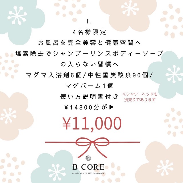 お風呂を完全美容と健康空間へ 塩素除去でシャンプーリンスボディソープのいらない習慣へ ・マグマ入浴剤 ・中性重炭酸泉90錠入 ・マグバーム1個 ¥14,800→¥11,000